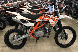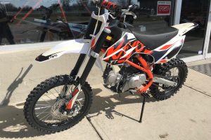 Looking for something a little more aggressive? The TD 125 has inverted forks, large disc brakes with a semi-automatic 4-speed transmission so you don’t need to worry about clutching. 14 and 12 inch wheels, seat height is 29.5 inches and weighs just 143 pounds. Electric and kick start.
