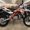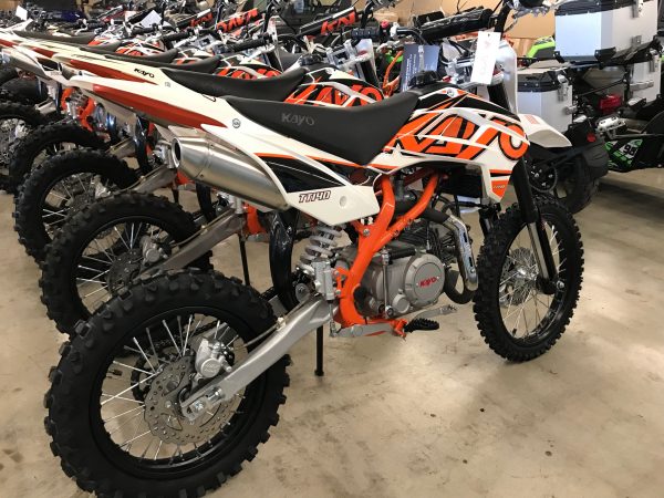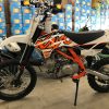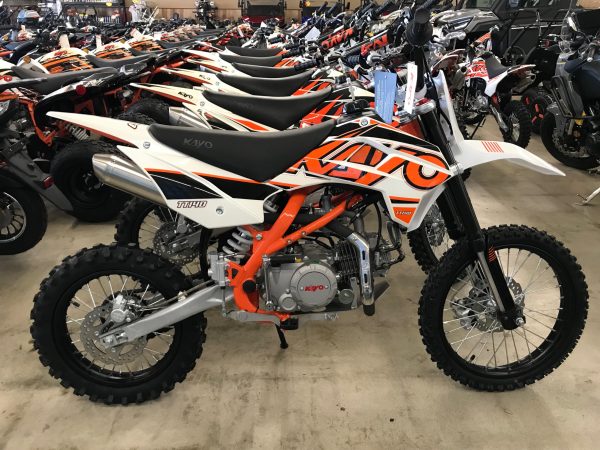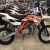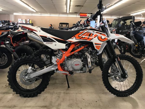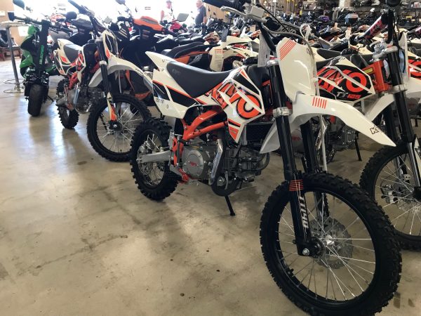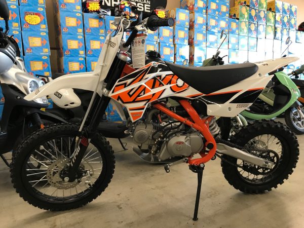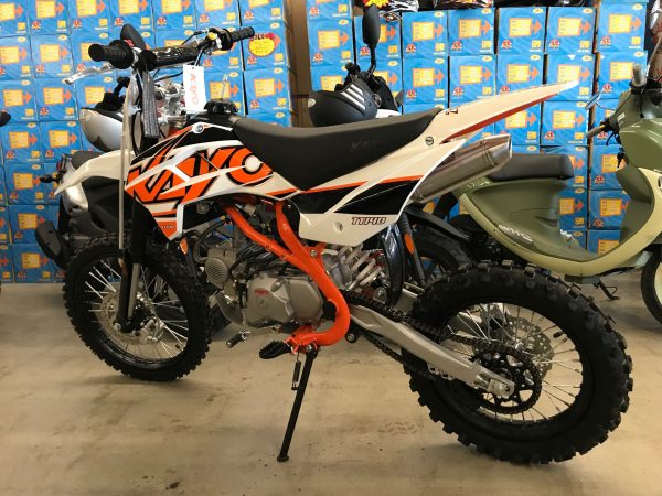 Our biggest, most powerful model is the TT 140. A 4-speed manual will have you ready for the gate drop and large disc brakes stop on a dime and give you 9 cents change. Inverted forks and a beefy shock soak up the terrain with ease. 17 and 14 inch wheels, a seat height of 33.6 inches and weigh is just 161 pounds. Electric and kick start.